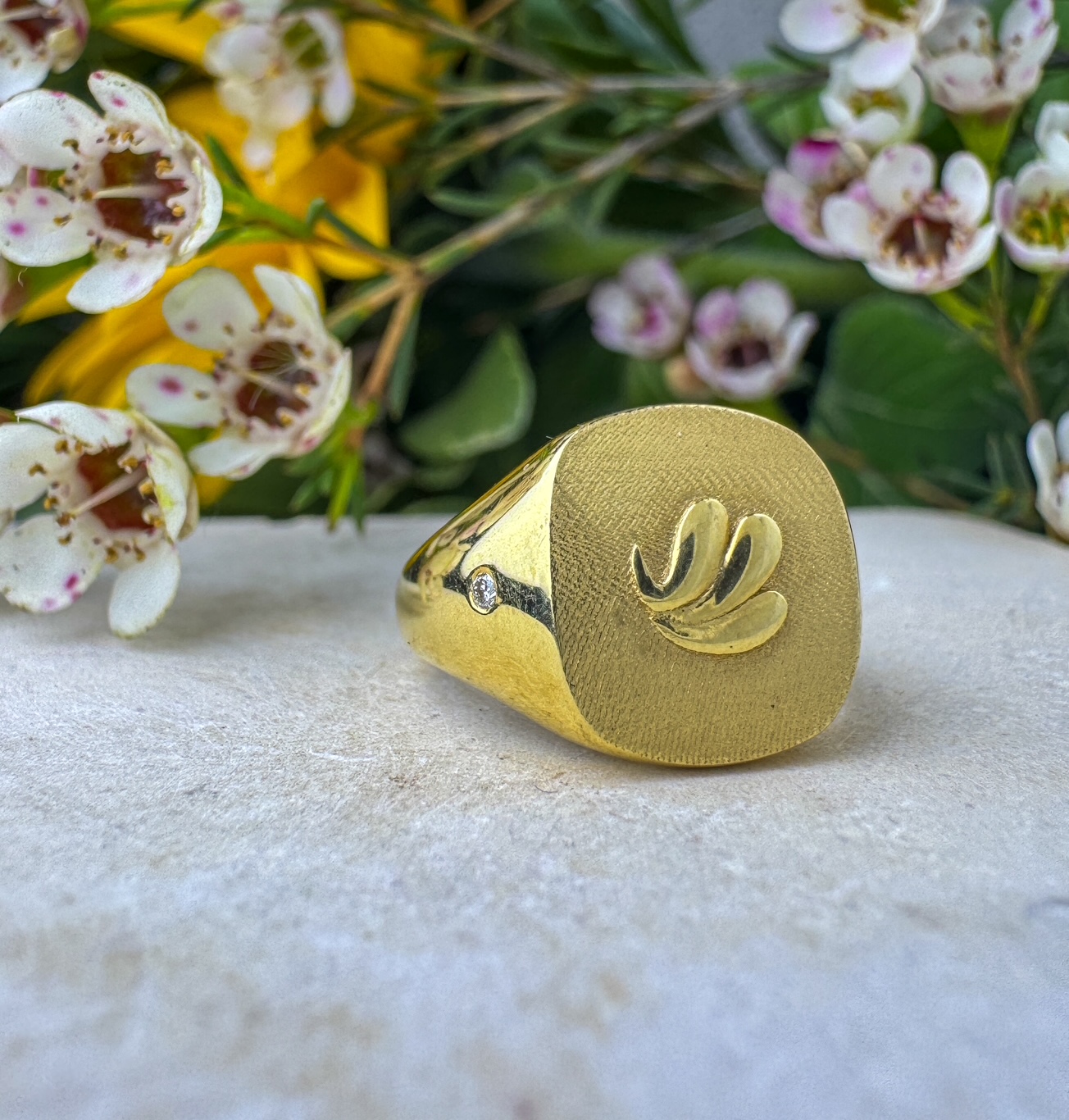 טבעת בסגנון חותם עתיק, טבעת מושלמת עם טקסטורה יחודית ותבליט מעוף הציפור משובצת יהלום בודד צדדי
