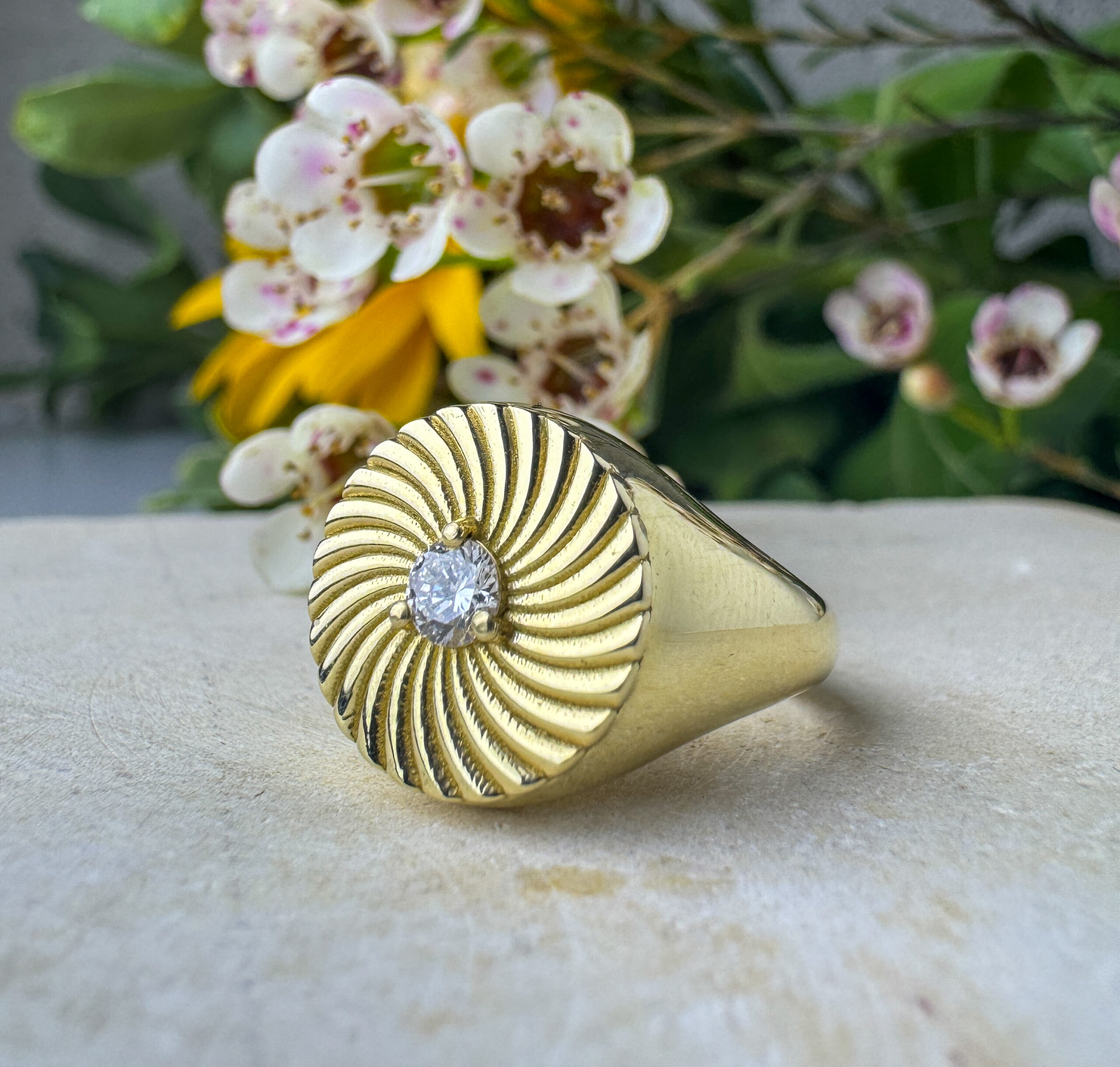 טבעת בסגנון חותם עתיק, טבעת מושלמת עם טקסטורה יחודית משובצת יהלום מרכזי