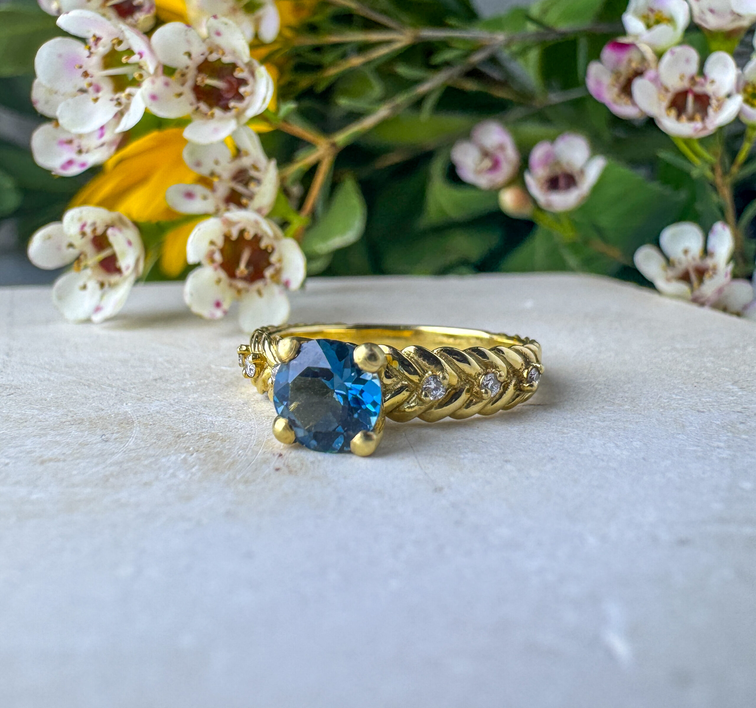 טבעת בסגנון רומנטי, טבעת מושלמת בעיצוב צמה יחודית משובצת יהלומים ובמרכזה משובצת אבן טופז מרכזית
